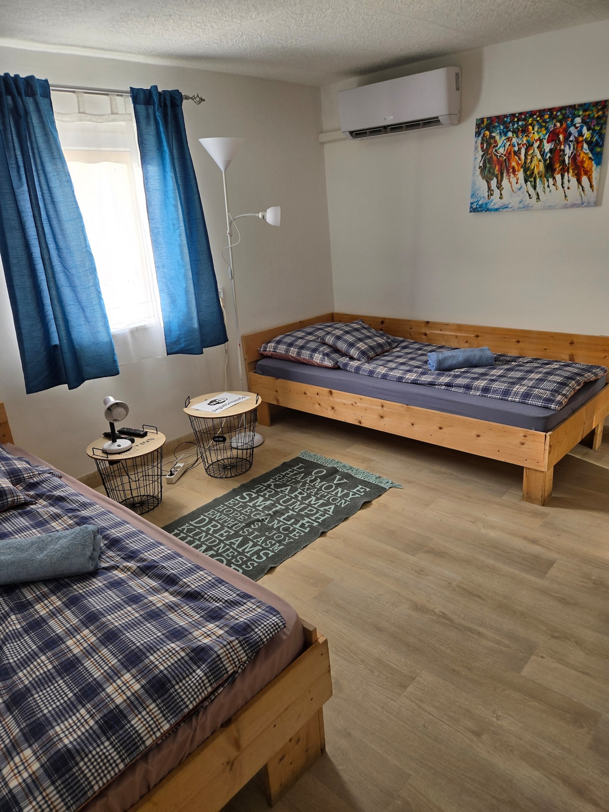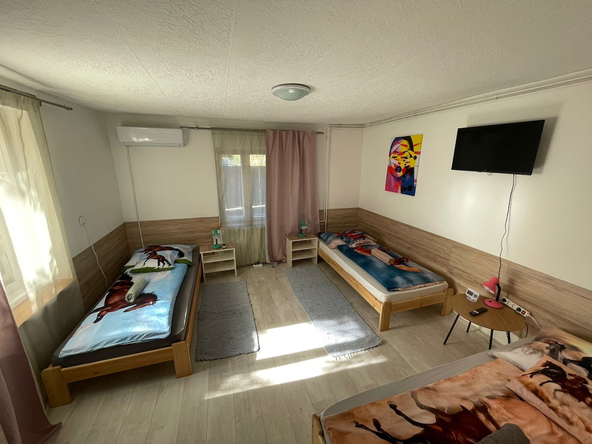 A two-storeyed family house with spacious rooms is for rent in a quiet street, just a few hundred meters from the city center. The house is newly renovated with new beds, mattresses, kitchen appliances, air-coondition and freshly finished bathrooms. We are looking forward to see you! (800huf/night/person tax has to be payed at the check in for over 18 years old guests) Room 1: a single bed Room 2: a single bed, and a double bed Room 3: Two single beds Room 4: a double bed + two bathrooms