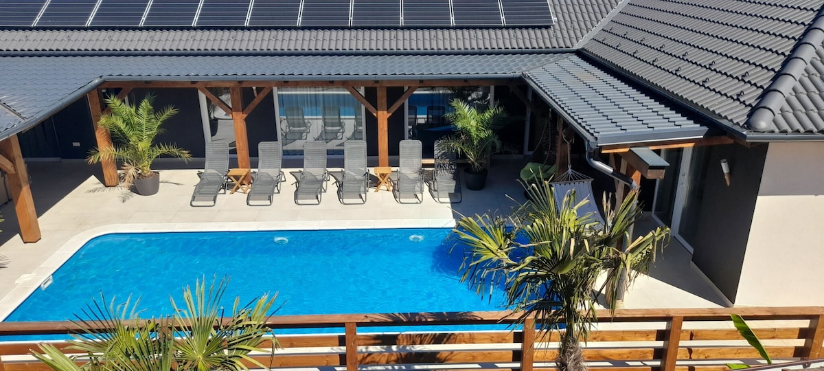 Tiszakécskén, nyugodt környezetben található gyönyörű nyaralónk 13 fő számára kínál kényelmes pihenést. A ház teljesen felszerelt, modern konyhával, tágas szobákkal. A vendégek élvezhetik a medencét, a privát szaunát és jakuzzit, ideális választás a feltöltődésre. A csendes, zöld környezet tökéletes a pihenéshez, míg a közeli Tisza-part és strandok számos szabadidős lehetőséget kínálnak. Foglaljatok, és élvezzétek a nyugalmat és kényelmet!