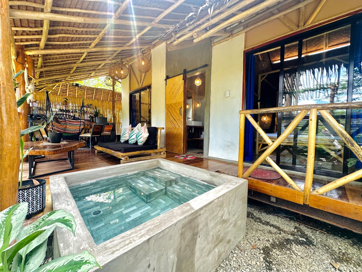 SUNRISE VILLA features 2 spacious bedrooms and 2 bathrooms, comfortably accommodating up to 6 guests. Each bedroom is furnished with one large bed and one single bed, providing a cozy and flexible sleeping arrangement for both adults and children. Please note: The base rate does not include our essential service package, which is highly recommended due to our remote, nature-surrounded location, approximately one hour by boat from El Nido. (See "Other details to note" for more information)