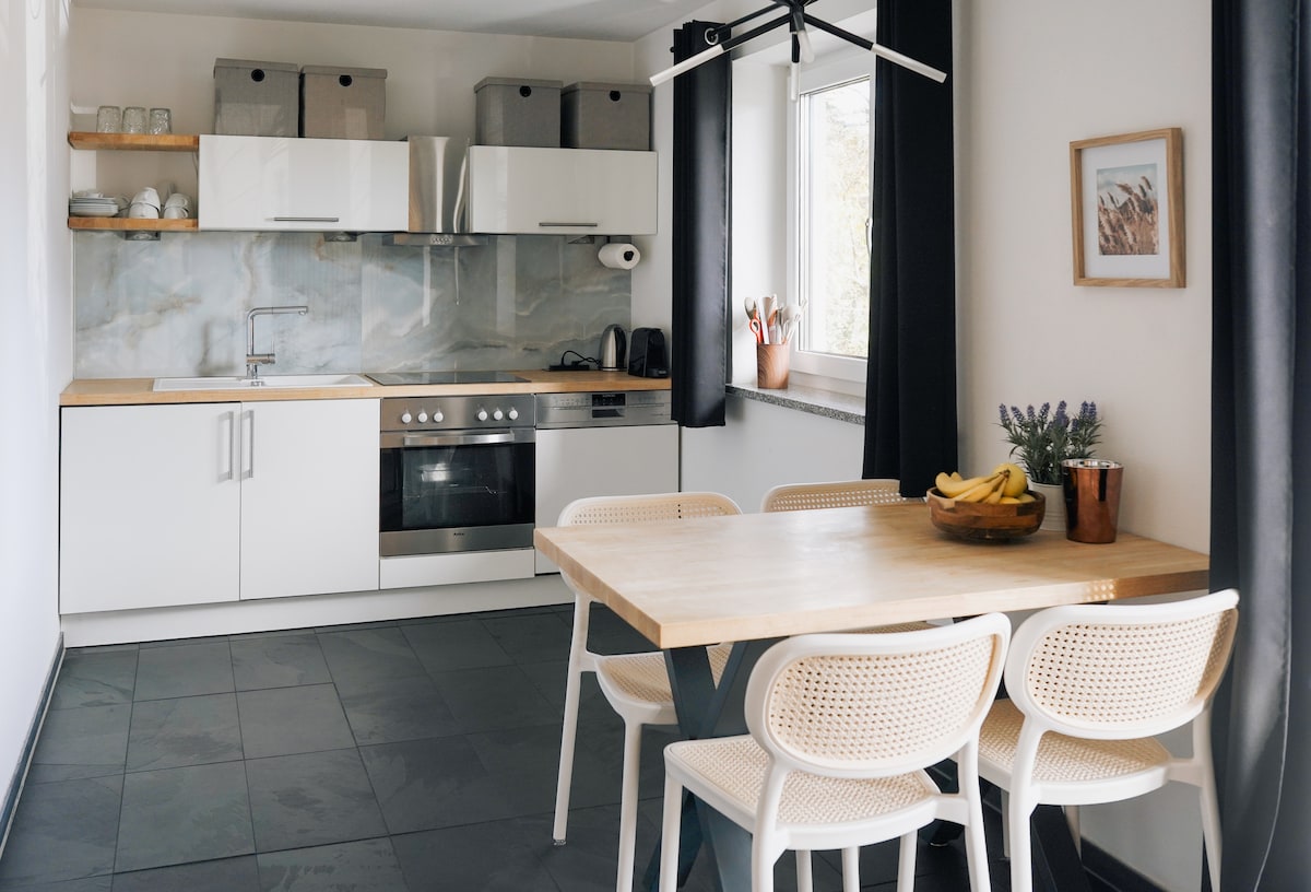 Willkommen in unserer modernen und neu erbauten 2-Zimmer-Souterrain-Wohnung, perfekt für Gäste, die auf der Suche nach modernen Wohnkomfort und Ruhe sind. Die Wohnung ist voll ausgestattet und mit viel Liebe zum Detail eingerichtet. Außerdem verfügt sie über eine private Terrasse. HINWEIS: Die Wohnung ist nicht barrierefrei! Der Eingang zur Wohnung führt über eine Treppe. Die Wohnung liegt ländlich 5 min mit dem Auto von Wasserburg am Inn entfernt. Privater Parkplatz direkt vor der Wohnung.