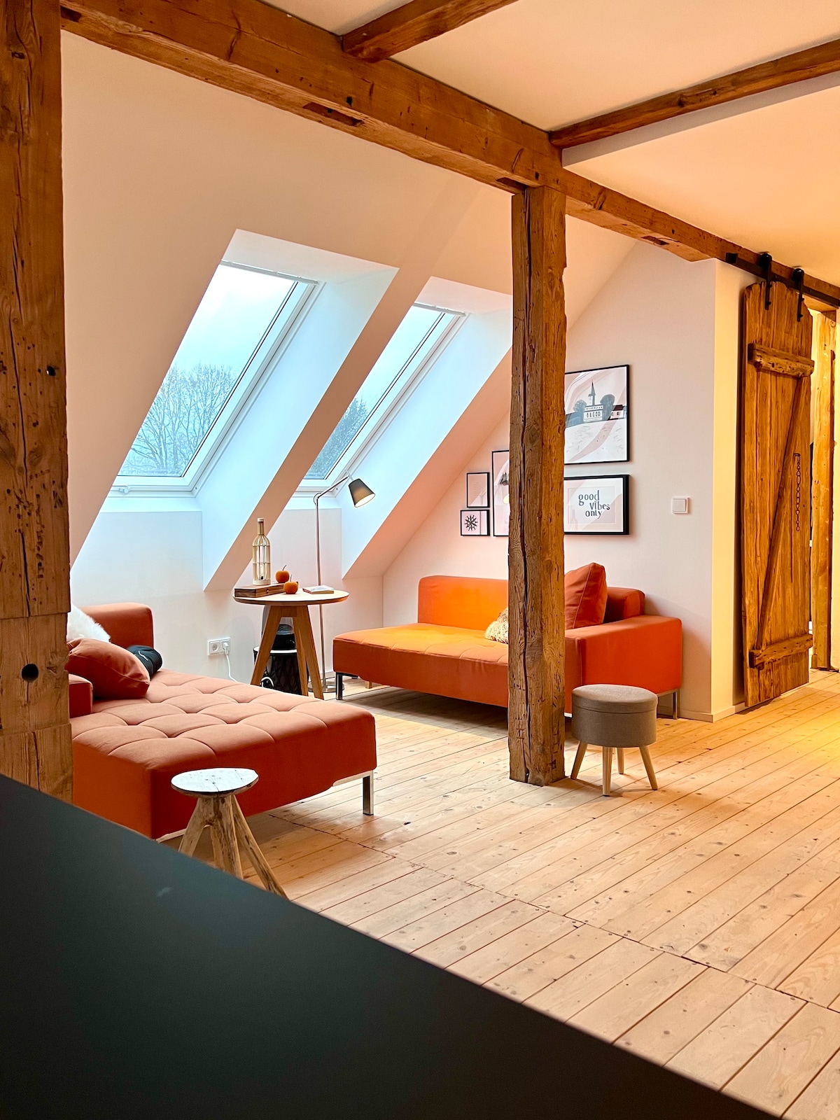 Dachgeschoss Wohnung 20 Autominuten von Potsdam und Berlin und 30 Zugminuten vom BER entfernt. Großzügige, vollausgestattete Designküche*, Badezimmer mit Agape Vieques Badewanne und passendem Waschbecken * , Schlafzimmer mit 2,70m großem Bett * , Fitnessraum kann als zweiter Schlafbereich genutzt werden. Hier ist ein 1,80m Doppelbett*Beamer mit App Vorinstallation für NETFLIX, Disney + und Amazon Prime Login, Spielsachen, Supermarkt mit Bäcker und Fleischer Getränkemarkt*Badeseen&Wandern