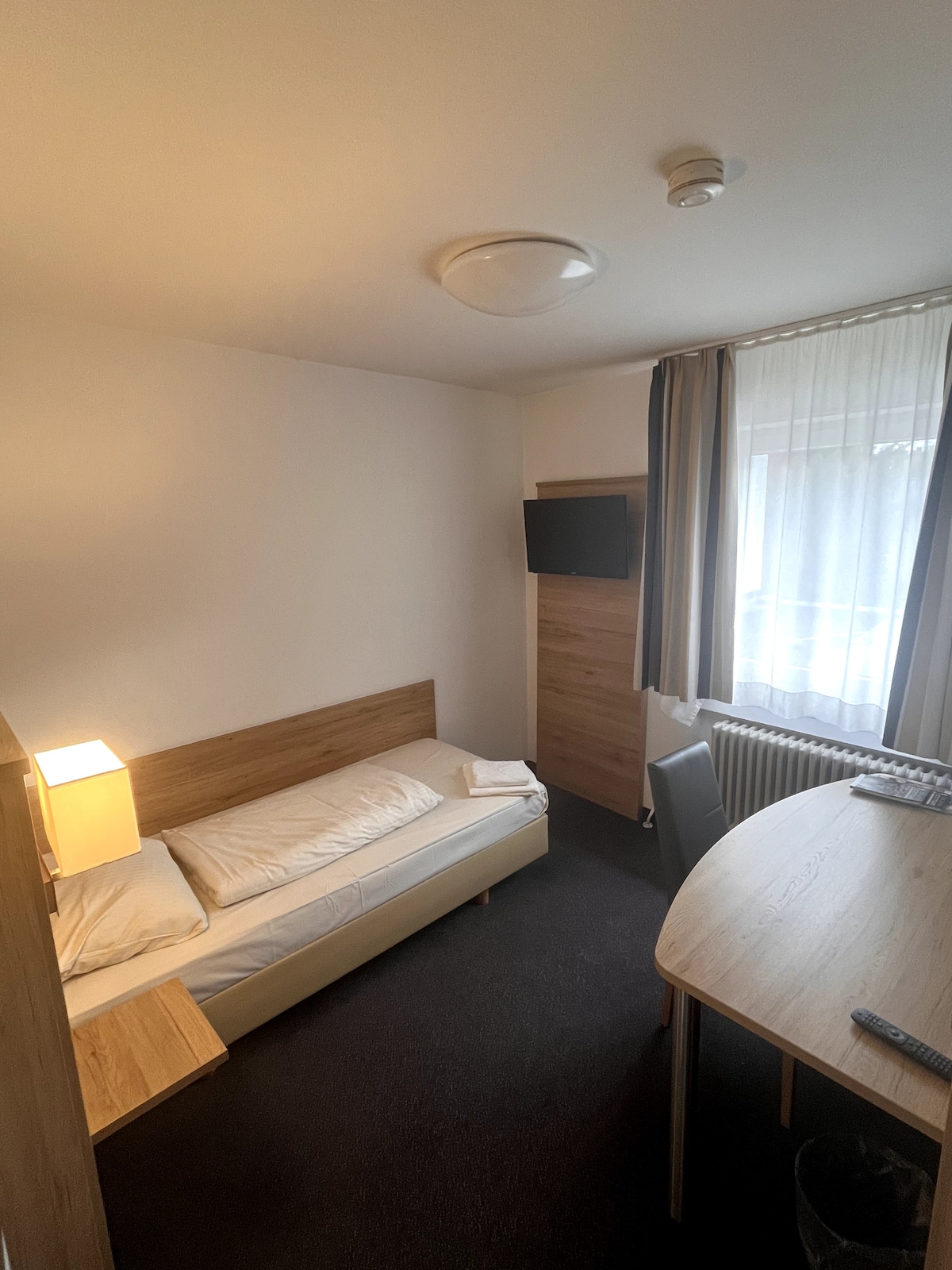 Klassisches Einzelzimmer – Privat & Komfortabel Unser gemütliches Einzelzimmer eignet sich ideal für Alleinreisende oder Geschäftsreisende. Es verfügt über ein bequemes Bett, ein eigenes Bad sowie eine funktionale Einrichtung mit Schreibtisch und Kleiderschrank. Ruhig, sauber und einfach zum Wohlfühlen. Kostenloses WLAN Flachbild-TV Heizung Frische Handtücher & Pflegeprodukte