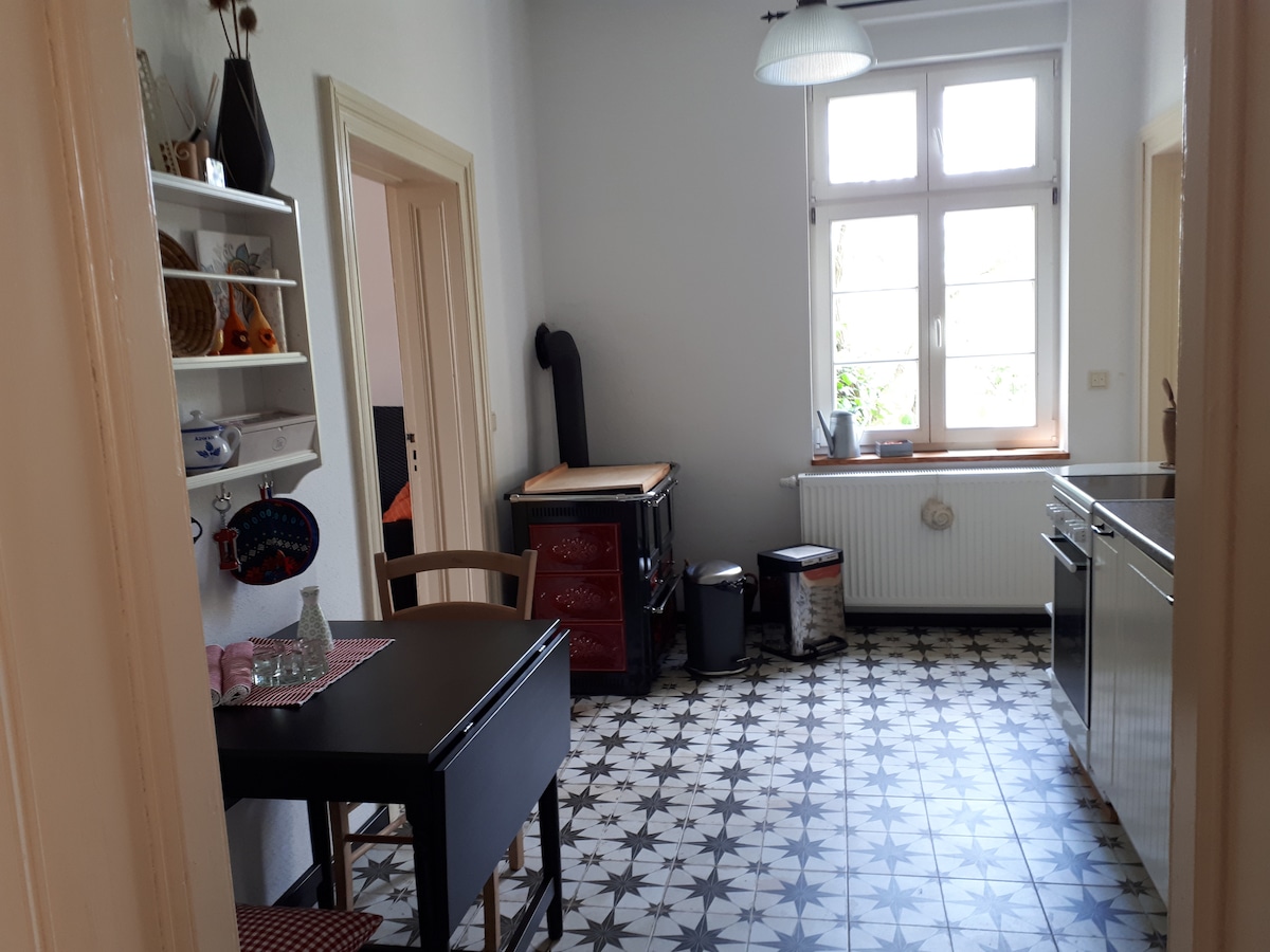 Es erwartet Sie ein aufwendig restauriertes Schulgebäude von 1873. Die Wohnung besticht durch viel Holz und die mit Lehm verputzten Wände. Im Garten, direkt an der Pferdekoppel, erwartet Sie eine alte Feldsteinscheune, in der Sie ein großes Kaminzimmer, eine Infrarotkabine, eine holzbefeuerte Sauna und ein Bad finden.