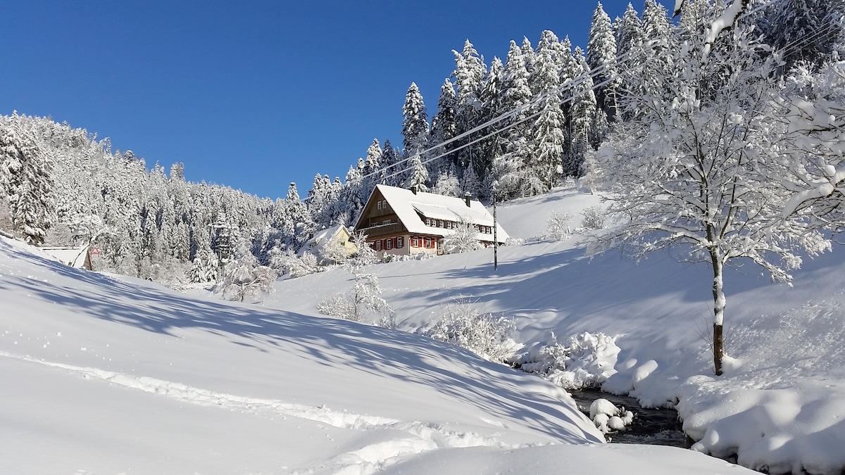 Our Heidi House is located in the middle of the Black Forest, in a small valley surrounded by green meadows. Next to the Heidi house is the farm we live on. The Heidi house is detached and has a separate entrance, so your privacy is guaranteed. The farm is located at the end of a road, with no traffic passing through, and is surrounded by meadows, fruit trees and forest. Our own stream and a small pond with a bench on the property invite you to relax.