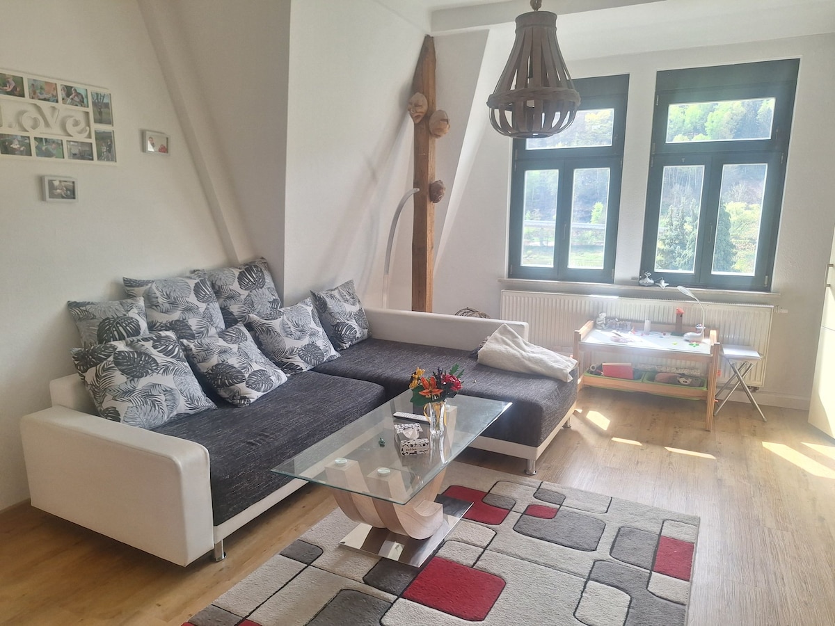 Eine kuschelige 70 qm2 große Dachgeschosswohnung über den Dächern von Sebnitz, der Seidenblumenstadt, erwartet Euch. Die Ferienwohnung verfügt über zwei Schlafzimmer, ein großes Wohnzimmer, Duschbad und eine vollausgestattete Küche. In der neu eingerichteten Küche findet Ihr neben dem Induktionsherd einen Miele-Geschirrspüler sogar einen Siemens-Waschtrockner. Euren Wagen parkt Ihr direkt auf dem kostenlosen privaten Parkplatz hinter dem Haus. 2 Ladestationen für Euren Tesla sind nebenan.