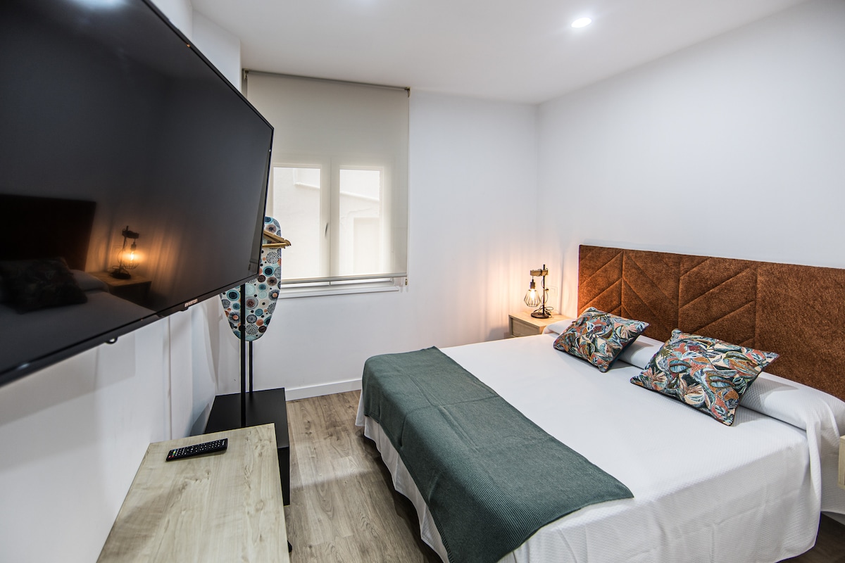 Apartamento doble de 24 metros cuadrados con vistas a la Plaza de España situado en la primera planta del edificio. Cuenta con cocina completa, vitrocerámica, frigorífico, microondas, lavavajillas, cafetera tipo nespresso, tostadora, utensilios de cocina y vajilla. Baño completo con toallas, amenities y secador. Cama de matrimonio y tv pantalla plana. Wifi. Aire acondicionado y calefacción.