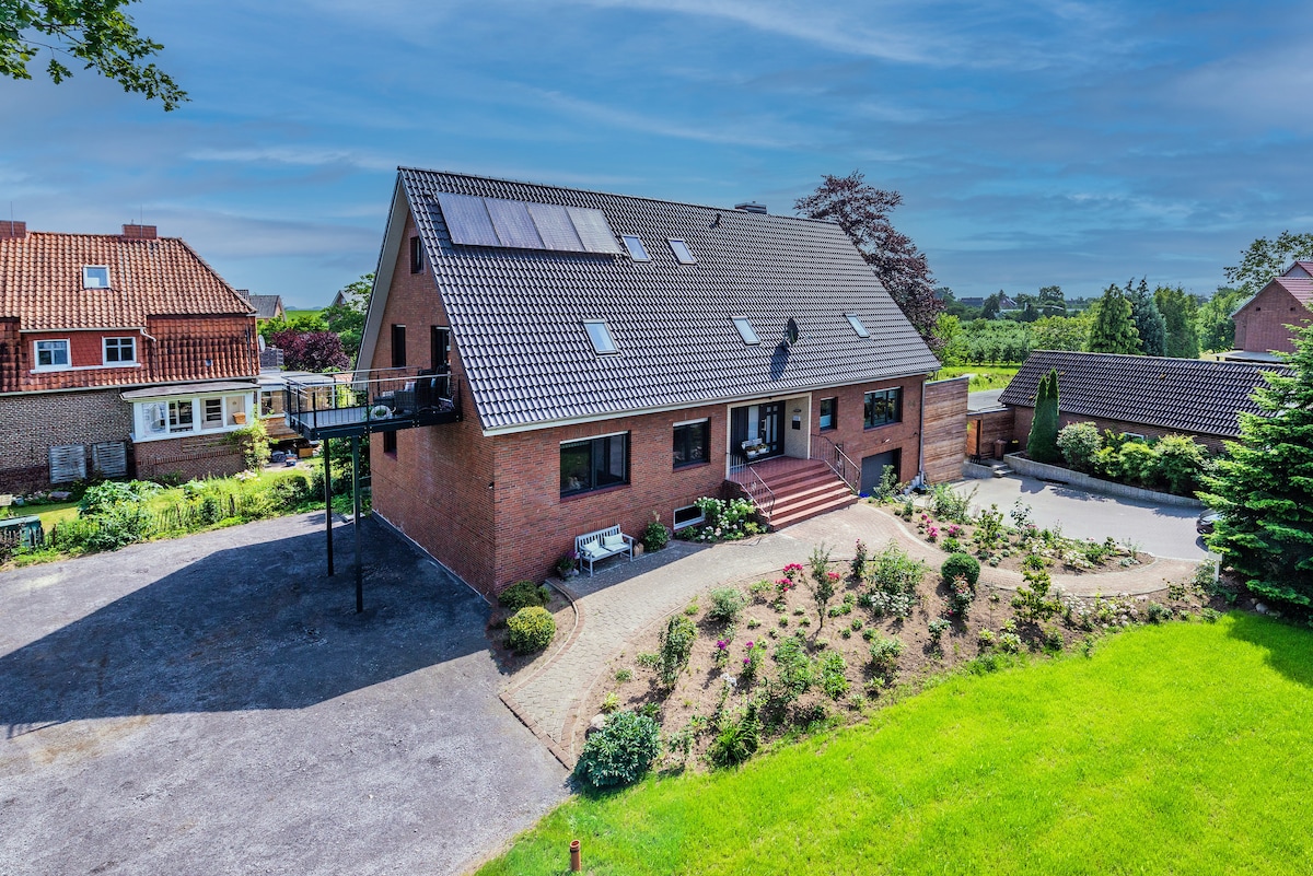 Die gemütliche Landhauswohnung ist frisch renoviert. Mit Liebe zum Detail wurde ein gemütlicher Rückzugsort für Reisende im Alten Land geschaffen. Neues Echtholzparkett und Italienische Bodenfliesen treffen hier auf die historischen Balken des Bauernhauses. Der Hof hat Direktzugang zu einem schönen Landweg entlang der Obsthöfe. Vor allem in der Blütezeit bietet es sich an, ausgiebige Radtouren entlang der Obstbäume zu machen. Durch die sehr nahe gelegene Elbe kommt zudem ein maritimer Flair auf.