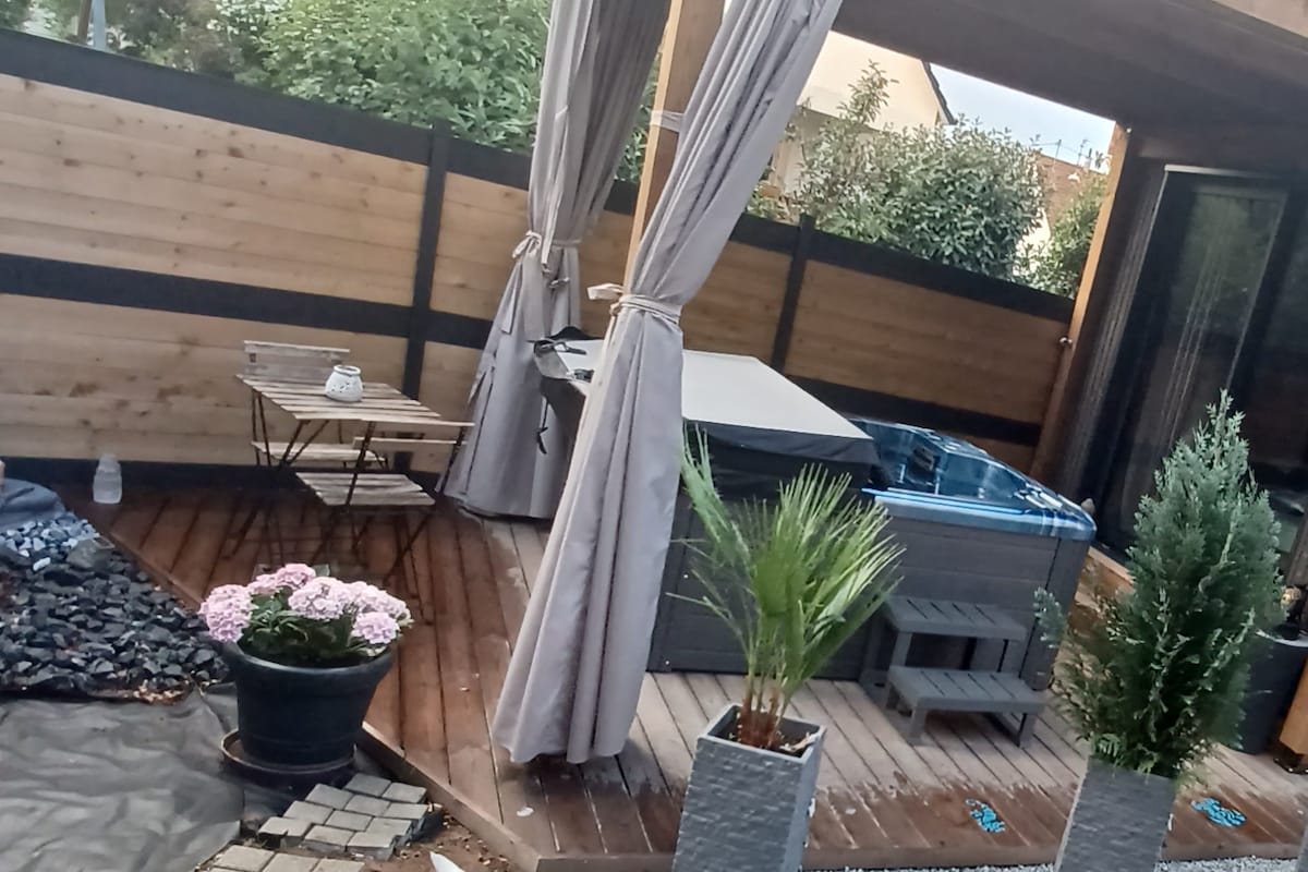 Petite dépendance de 30m² fraîchement rénovée au fond du jardin. Vous serez au calme dans la pièce à vivre de 25m² au lit confortable, à la cuisine tout équipée. Il y a une petite salle de bain indépendante. Vous profiterez du Wifi et d'une TV avec Netflix. Arrêt de bus ligne 44 de la CTS qui relie la gare d’Entzheim. Possibilité de réserver un Flex’hop ou de louer un vélo Vel’hop à la gare d’Entzheim. 2km en piste cyclable du cocon.