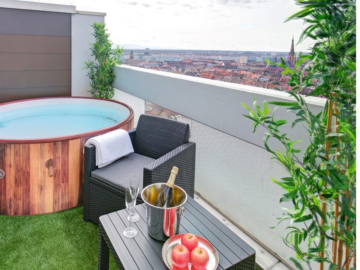 Luxurious 3BR penthouse in Karlsruhe for up to 9 guests. Features 3 private rooftop terraces with a jacuzzi, electric grill, and stunning panoramic views of the city, Black Forest, and France. The building offers elevator access directly to the apartment level on 18th floor and convenient self check-in via smart lock. High-speed internet is included. Perfect for families, groups, or business travelers seeking a unique city oasis.