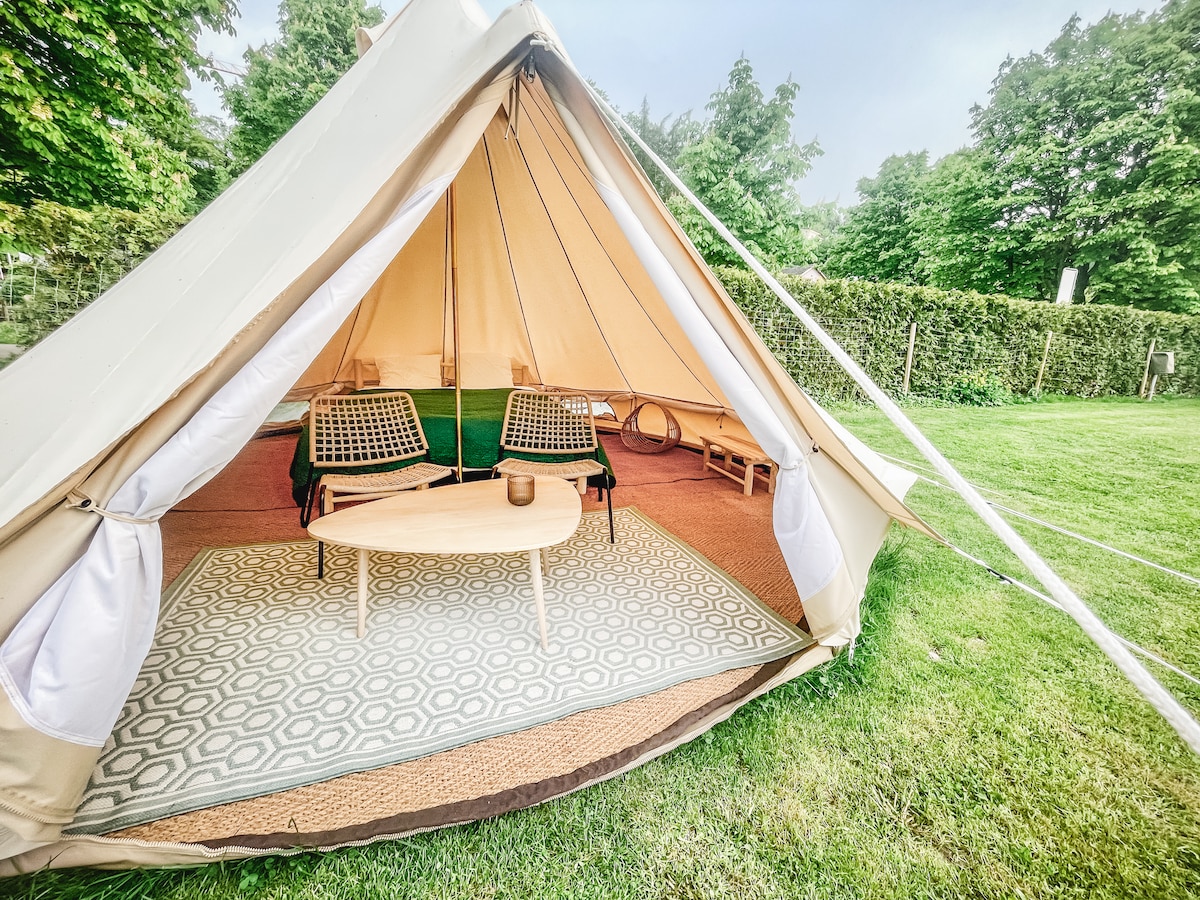 Unser Glampingzelt ist ganz anders, als du dir gewöhnliche Zelte vorstellst. Es bietet ein geräumiges und schön dekoriertes Interieur mit einem Durchmesser von 5 m, ein bequemes Doppelbett, hochwertige Bettwäsche und eine kleine Kaffeemaschine. Und das Allerbeste? Du geniesst Seeblick direkt aus dem Bett! Stell dir vor, du wachst mit den sanften Klängen der Natur im Hintergrund auf und startest den Tag mit einer Tasse Kaffee auf deiner privaten Terrasse, nur wenige Meter vom Bodensee entfernt.