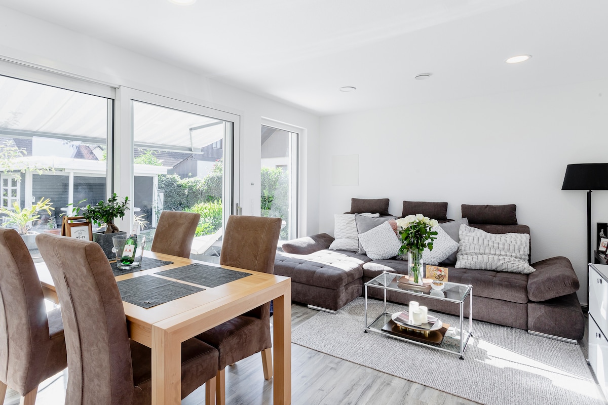 Frühstück unterm Apfelbaum oder ein Abend vorm Kamin – dieses originelle Haus macht’s möglich. Durch die großen Fenster hat man einen herrlichen Blick auf die Schweizer Alpen. Und wer Sonne tanken möchte, macht es sich auf der Terrasse oder im Garten gemütlich. Mit Schwedenofen wohlig beheizt. Shopping im historischen Waldshut mit schönen Cafe's und Restaurant's. Traditionelle Gasthöfe mit lokalen Produkten in nächster Umgebung. Städte wie Zürich oder Freiburg bieten sich zum Tagesausflug an.