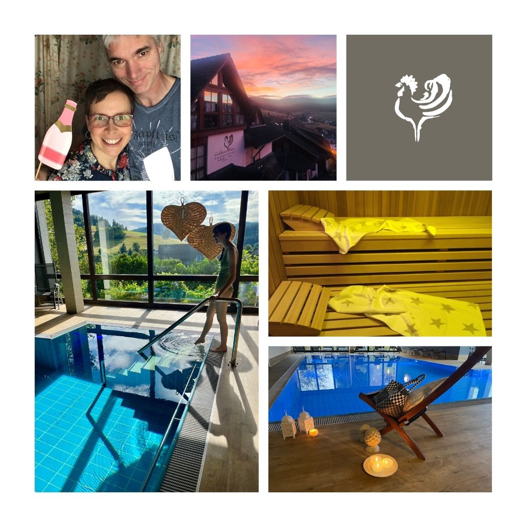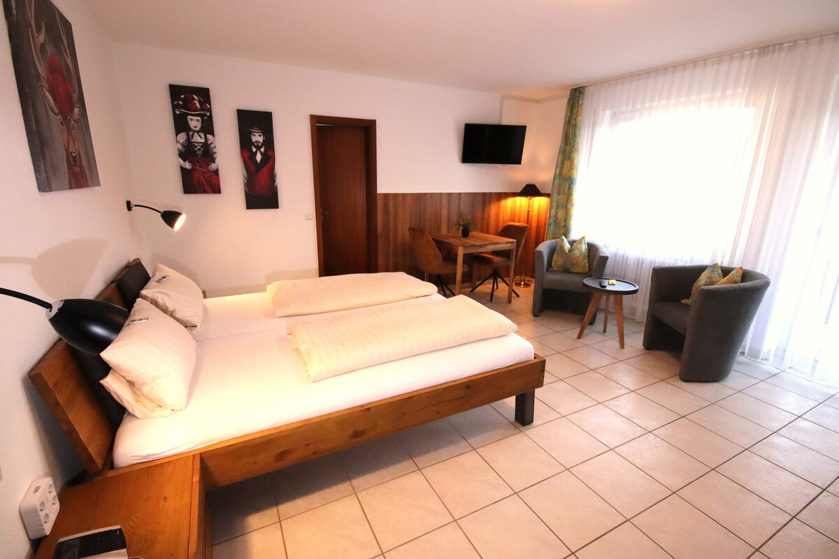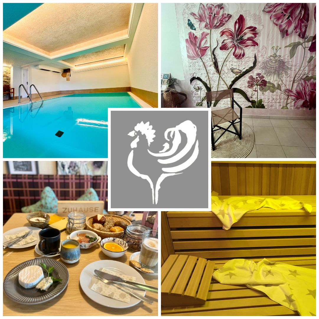 Frühstücksbuffet täglich von 8:00 bis 9:30 Uhr ist im Preis inklusive: Müsli & Bio-Naturjoghurt Brot, Brötchen & Toast Schwarzwälder Schinken, Kochschinken, Salami und milder Käse Hausgemachte Marmelade, Honig & Nutella Eier von glücklichen Hühnern zum Selbstkochen DAZU gratis Nutzung Pool 8 - 19 Uhr und Sauna 17 - 18.30 Uhr (Bitte eigene Handtücher mitbringen). Fahrradgarage kostet 4 Euro pro Nacht. Die max. Temperaturen im Badbereich 22 Grad und 17 Grad im Schlafzimmer.