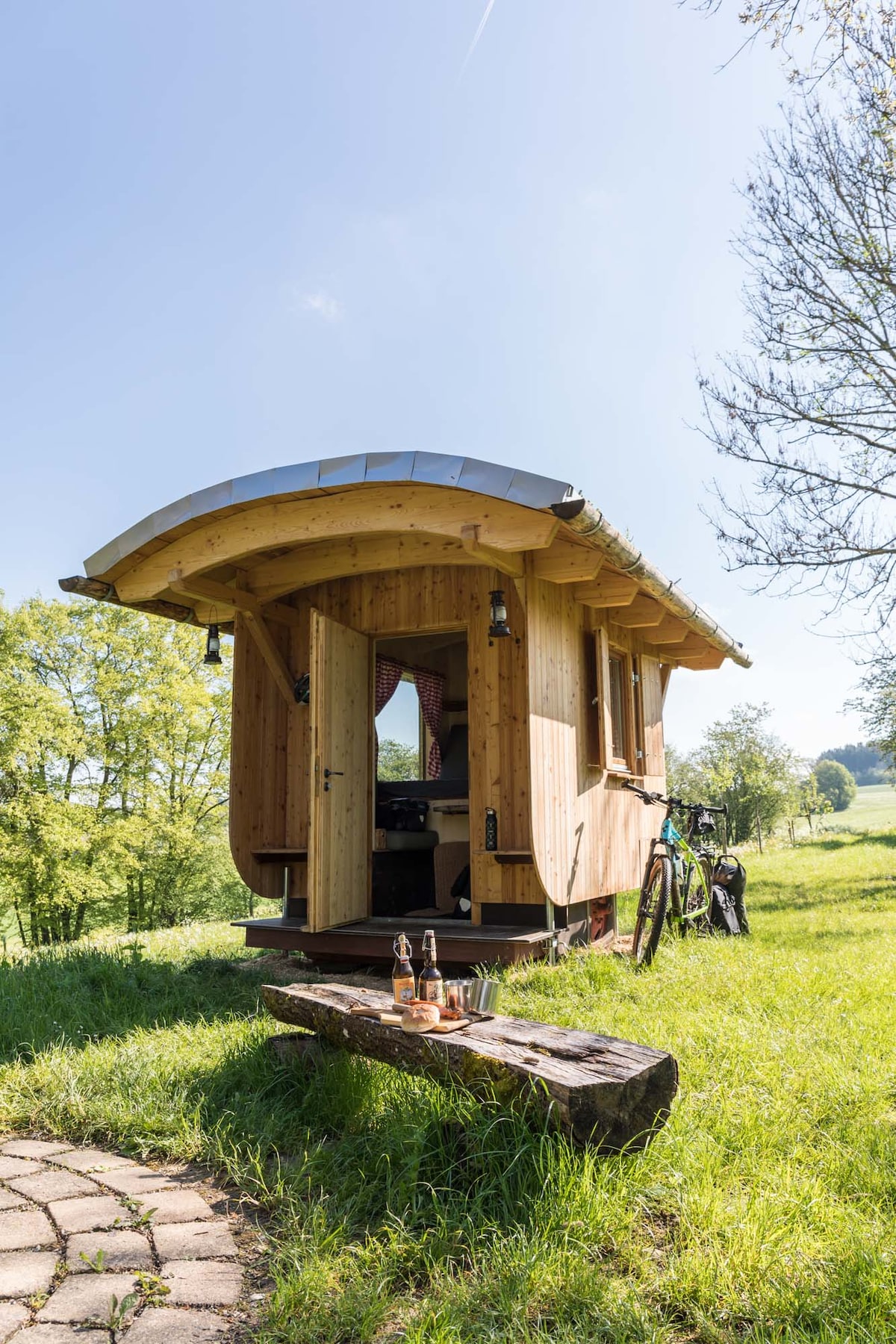 Unser außergewöhnliches Tiny house liegt auf einem großen Grundstück mit altem Baumbestand und bietet einen wunderschönem Panoramablick auf die umgebende Natur. Unser Tiny house hat ein Bad mit freistehender Badewanne vor einem Panoramafenster, eine über eine Wendeltreppe erreichbare Schlafebene, eine vollausgestattete Küche und eine Sauna in einem separaten Gebäude. Im Außenbereich bieten wir eine Holzterrasse mit Pergola, eine Außendusche und einen 1700qm großenGarten.