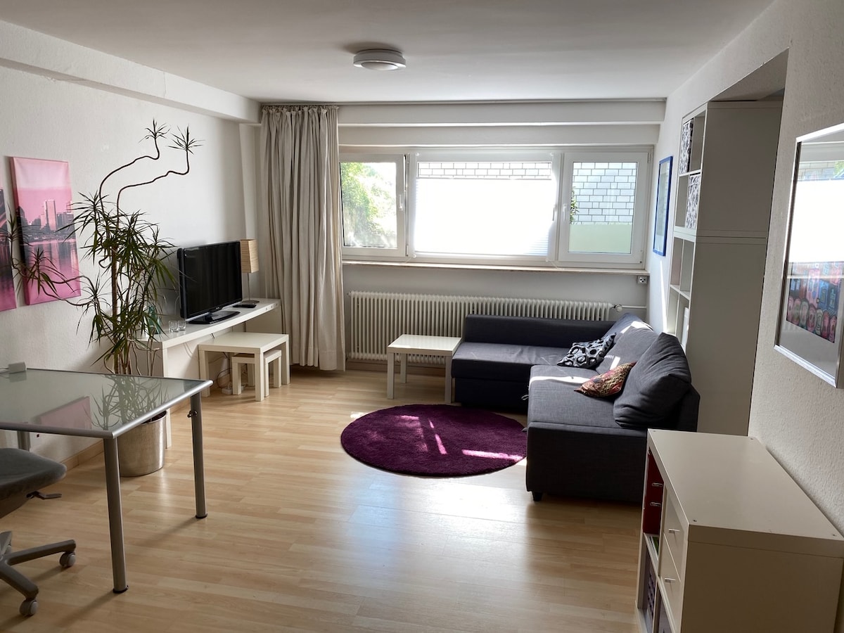 Ihr bekommt eine schöne, gemütliche und helle 1-Zimmer-Wohnung im 2.Stock.Die Einrichtung beinhaltet Schreibtisch, Doppelbett, Kleiderschrank, Kabel-TV, Sofa, Couchtisch u 1 voll ausgestattete Kochecke mit Kühlschrank, 2 Kochplatten u Mikrowelle. Natürlich ist kostenloses WLAN inbegriffen. Das modern geflieste Badezimmer mit Fenster befindet sich direkt neben der Wohnung zur alleinigen Benutzung . Die Nachbarschaft ist freundlich. In der gesamten Straße befinden sich kostenlose Parkplätze.