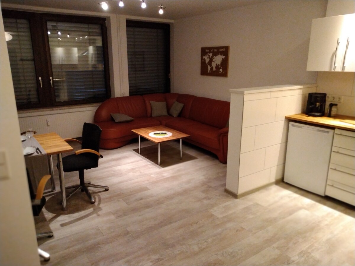 Das schöne modern eingerichtete 1-Zimmer-App. verfügt über einen sep. Hauseingang, ein großes Bett (140x200 cm), Sofa, weißen Ikea-Kleiderschrank, Esstisch, mit 2 Stühlen, Flachbild-Fernseher, Küche mit Mikrowelle (Heißluft), Kaffeemaschine, Tchibo Cafissimo, Toaster, Wasserkocher, Geschirr, Bad, Dusche, Spiegelschrank, Waschbeckenunterschrank, Internetverbindung, elektrische Rolladen in Wohn/Schlafraum und im Bad. Ein Föhn,Handwaschseife, Shampoo, Handtücher und Bettwäsche wird gestellt.