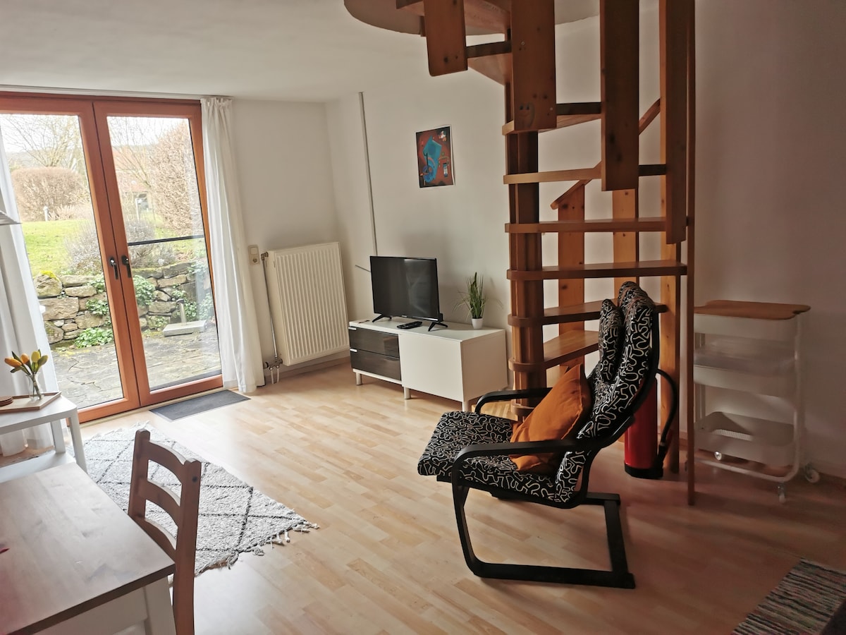 Sie ist 40 m² groß und liegt in einem 2-Familienhaus am Ortsrand von Lenglern. Auf der oberen Ebene befinden sich Eingang, das Schlafzimmer und Bad. Eine Wendeltreppe führt vom Schlafzimmer direkt nach unten in den Wohnbereich mit kleiner Küche. Davor liegt die kleine Terrasse. Öffentlicher Parkraum direkt vor dem Haus. Öffentliche Verkehrsanbindung nach Göttingen über Busse und Bahnen (in 9 Minuten ist der Zug am Göttinger Bahnhof)