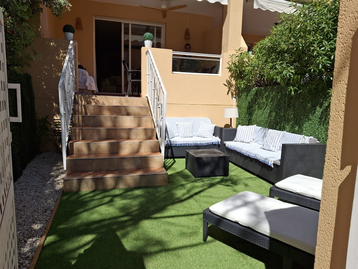 Precioso hogar con patio interior en una urbanización privada con localización top en Jávea. A solo 2' andando de la orilla del mar de una de las playas rocosas de Jávea y a 5' del pueblo, lo que hace que el entorno sea tranquilo y esté cerca de todas las comodidades, ocio y áreas sociales. Totalmente equipada, decoración acogedora y mediterránea. El patio interior es perfecto para cenar y hacer bbqs + paellas en verano, y tiene un jardín frontal donde desayunar disfrutando del sol de la mañana.