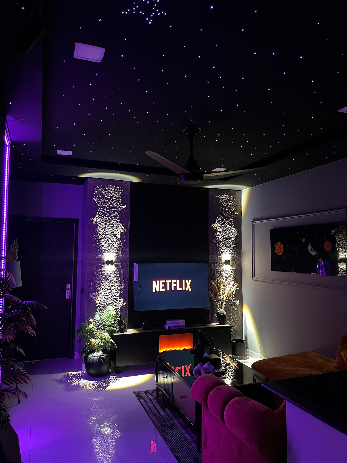 Luxury 1 BHK Ultra Premium Stary Lights Themed Apartment with 200 inch Projector screen for couples, friends, solo females and families as well located at Gulberg Lahore Peaceful and private area in the heart of Lahore Safe private & Secure Location - Self Check In with Pin Code - No need to meet anyone for keys - 24/7 Security - King Sized Bed With Soft Spring Mattress - 2 Ac - Kitchen with Electric Stove - Prime Location -Pool, Cinema, Gym -Basement Parking -Complimentary Snacks and Tea