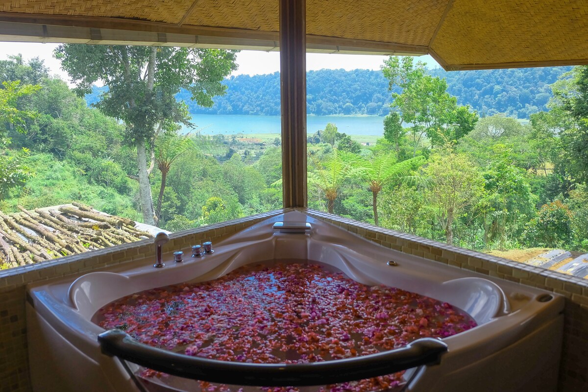 Four bedroom cabin that we've renovated applying a ski chalet concept. Each suite has a copper bathtub looking out on protected forest. The views are incredible with panoramas of Lake Buyan, Handara Golf Course, and steep mountains in the background. At 1,400 m. above sea level, we're blessed with eternal spring weather in the day time with chilly nights. Wake up early morning to the smell of conifers and take a walk to see jungle fowl, deer, civet cats, and a wide variety of birds.