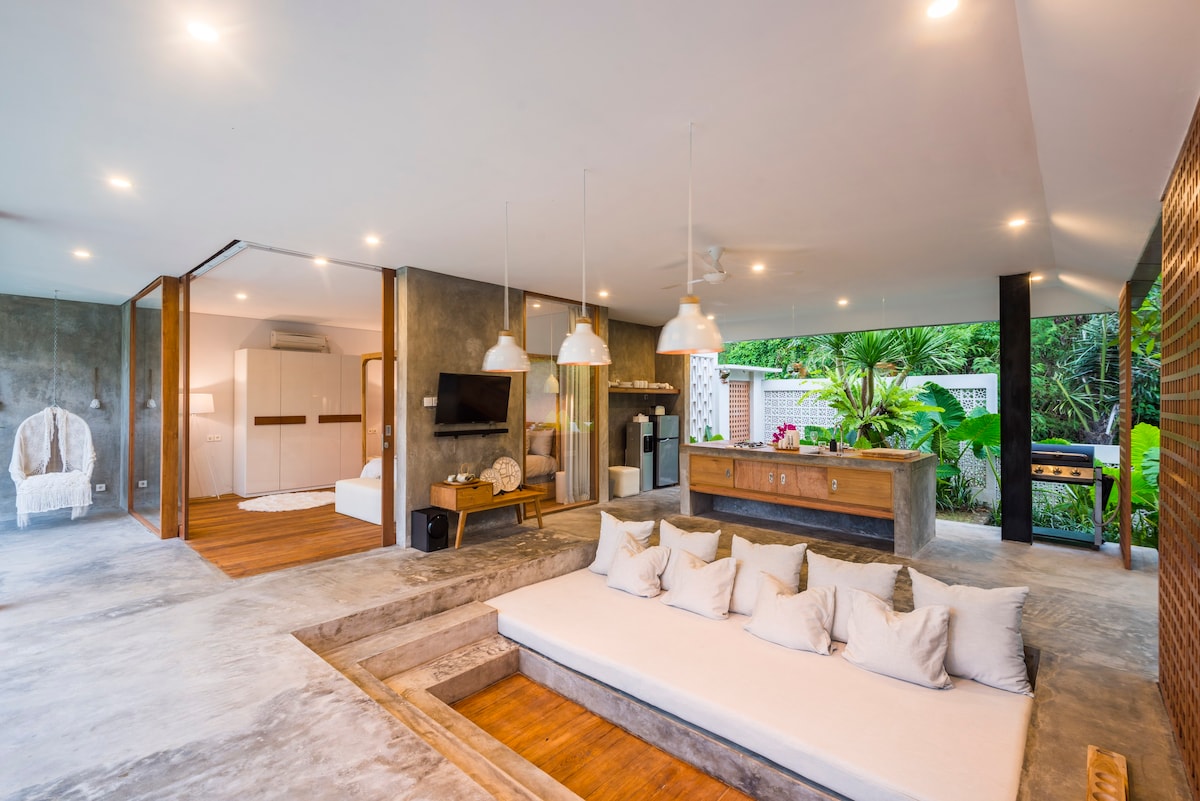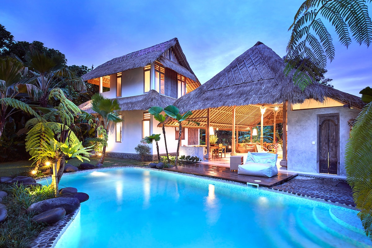Swing in a hammock in a relaxing indoor-outdoor space flowing with fresh air. Sunbathe on poolside loungers, then slip into the water to have a floating picnic. Refresh under a rain shower and fall asleep in a cool bedroom with teak furnishings. The villa includes a fully equipped central kitchen with built-in bar cabinet, a warm table and a comfortable living-room favor with chillout sofa and unique hammocks. A natural stone pool, teak deck, lounge chairs, hammock and indoor Plants.