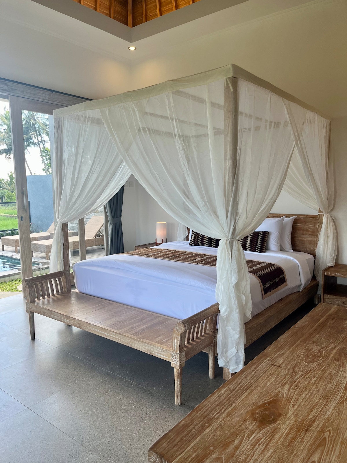 Let your cares slip away in the comfortable pavilion overlooking your private salt-water pool and stunning garden. Rinse off under the rain shower in the large open-air garden bathroom, then relax in the garden pavilion, taking in rice field and tropical garden views. Villa Via is luxurious and private, featuring a spacious bedroom with a king-size 4-poster bed, ensuite dressing room, and bathroom. The living area overlooks the fabulous garden and pool for ultimate relaxation.