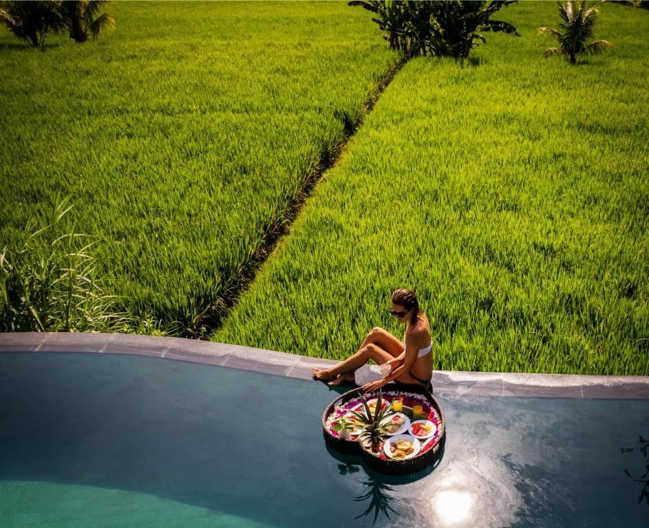 A mountain retreat bordering the UNESCO Heritage site Jatiluwih, equipped with a swimming pool facing the ricefields, a large garden and gazebo. You will be immerged into the Balinese rural life away from the tourist crowds, spending a few days hiking, relaxing in the hotprings, visiting Batukaru temple and the butterfly park, enjoying massage facing sunset, investigating local iconography in churches, with meals served by the neighbors or a nearby Balinese restaurant.