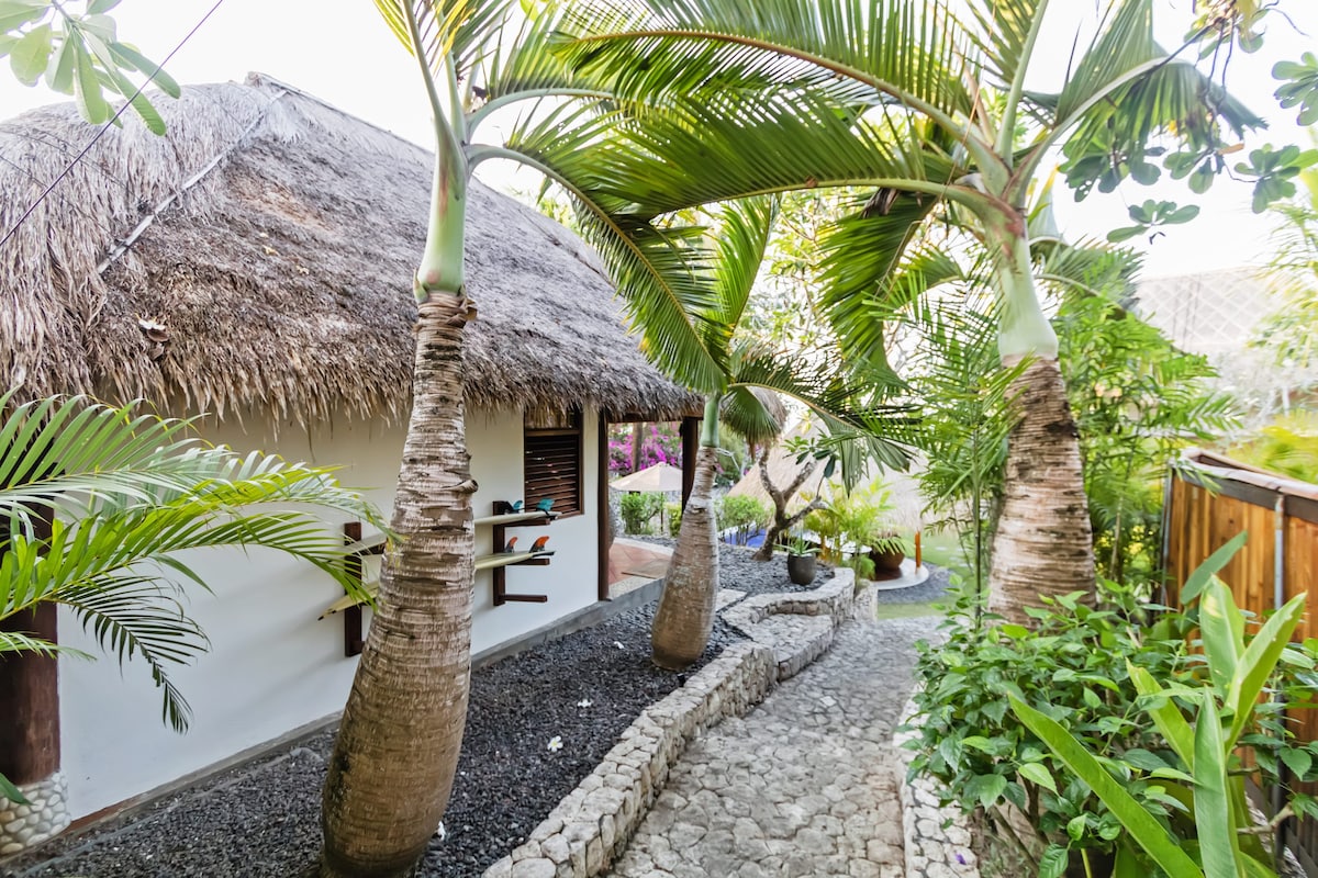Melati bali homestay is the wooden house that is surrounding by the fully garden,so it feel like a little jungle and little oasis in main of canggu,the open bathroom complete by the garden inside of bathroom. the location is in the central of canggu and close to everywhere you need like restaurant,money changer,and batubolong and echo beaches
