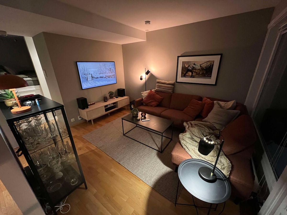 Len deg tilbake og slapp av på dette rolige, elegante stedet. Når du kommer inn døren så er du i stuen. Med privat balkong og peis. En sofa og queen size seng. Ta trappen ned for å komme til kjøkken og bad. Kjøkkenbenken er ganske liten, men den har induksjonstopp og stekeovn. Leiligheten passer for en til to personer som ønsker å være nær turterreng og skiløyper. Fint utgangspunkt for turer i naturen. Samtidig kun 30 minutter fra Oslo sentrum med museer og restauranter.
