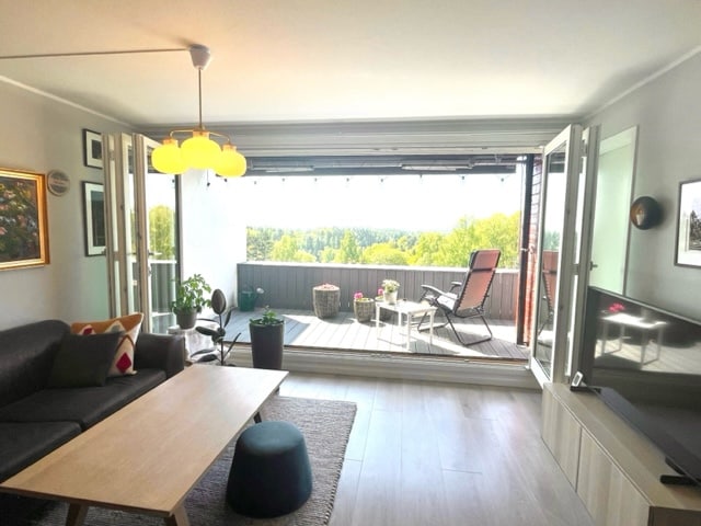 Leiligheten ligger stille å usjenert til men kort vei til alt . 20 kvm terrasse med fantastisk utsikt over Oslofjorden, leiligheten på 90 kvm ligger i 2 etg i enebolig , leiligheten er totaloppusset i 2021. Kort vei til t bane,buss,butikker, badestrand mm. 10 min til Oslo sentrum med bil.. Eier av huset bor i 1 etg, og det er felles inngang,men egen gang. Eier av huset har tilgang til eget loft i etg over leiligheten. Dette betyr at eier bruker felles trappegang. Det er Apple tv i stue å sove.