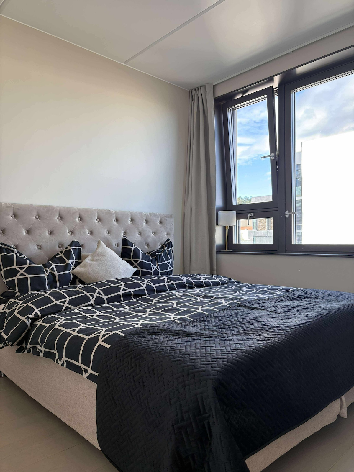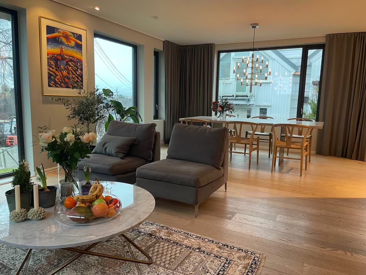Modern top-floor apartment in quiet, family-friendly Fornebu. Sleeps 4 with double bed and sleeping sofa. Bright and stylish with private balcony and great natural light. One stair up is a shared rooftop terrace. Fully equipped kitchen, fast Wi-Fi, and elevator access. Great bus connections to Oslo city centre and walking distance to Unity Arena. Close to beaches, parks, shops, and trails. Ideal for families, couples, or business trips. Affordable paid parking available nearby.