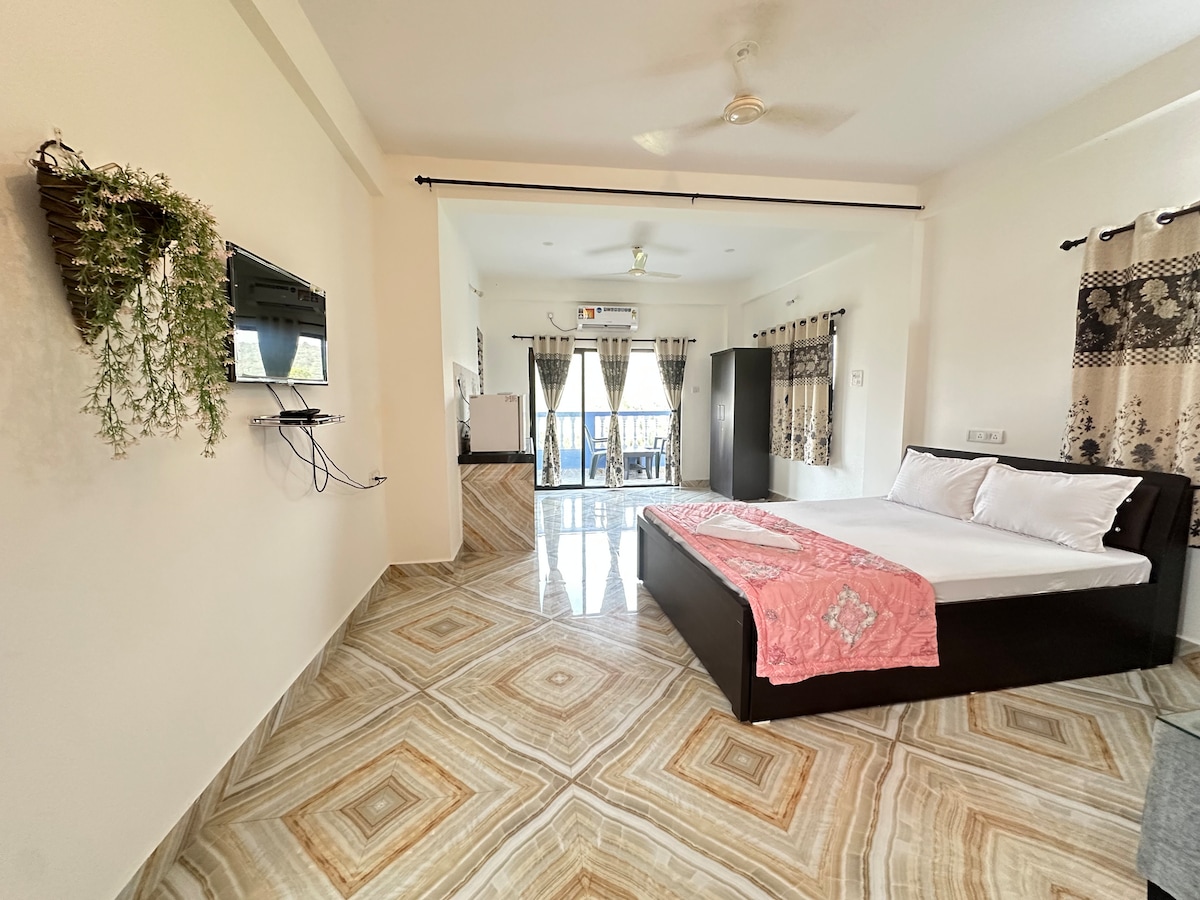 Cozy tropical themed studio in the heart of Vagator, just a short walk to the beach, Hilltop, Friday Night Market and top clubs like Romeo Lane & Mango tree restaurant. Styled with plants and earthy tones, it features a double bed, sofa & Smart TV, dining area, fully equipped kitchen and modern bathroom. Guests enjoy high-speed Wi-Fi, pool & gym access, parking for cars & bikes, 24/7 security & power backup. Perfect for couples, solo travelers or friends.