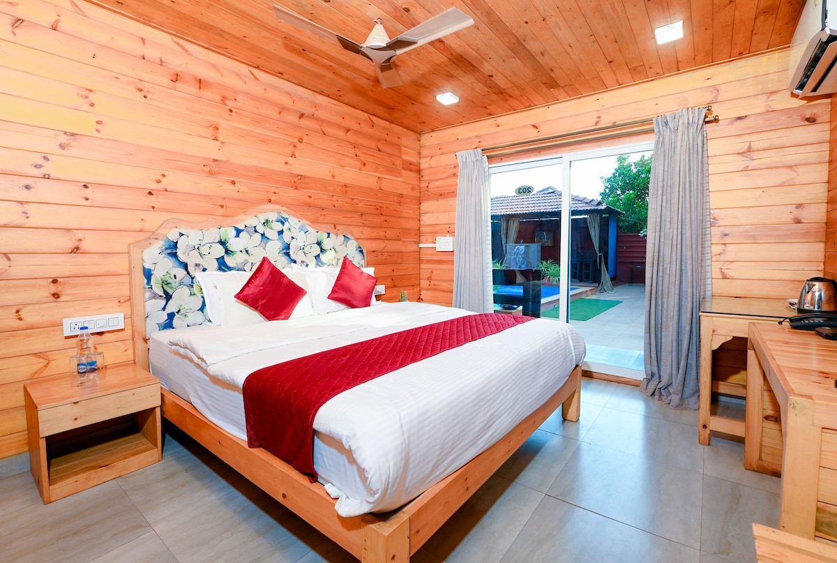 🌴 Luxury Wooden Chalet w/ Pool, Jacuzzi&Café – 2 mins from Candolim Beach Far from the noise & close to the waves, our elegant wooden chalet blends rustic charm with modern comforts. Indulge in a private relaxing Jacuzzi experience, enjoy plush bedding, and soak in calm beach vibes. Guests can also unwind at the shared pool, savor fresh bites at the on-site Café, and relax in cozy interiors perfect for couples, solo travelers, or even remote work. 🛁 Jacuzzi|☕ Café| 🏊 Pool|💻Wifi