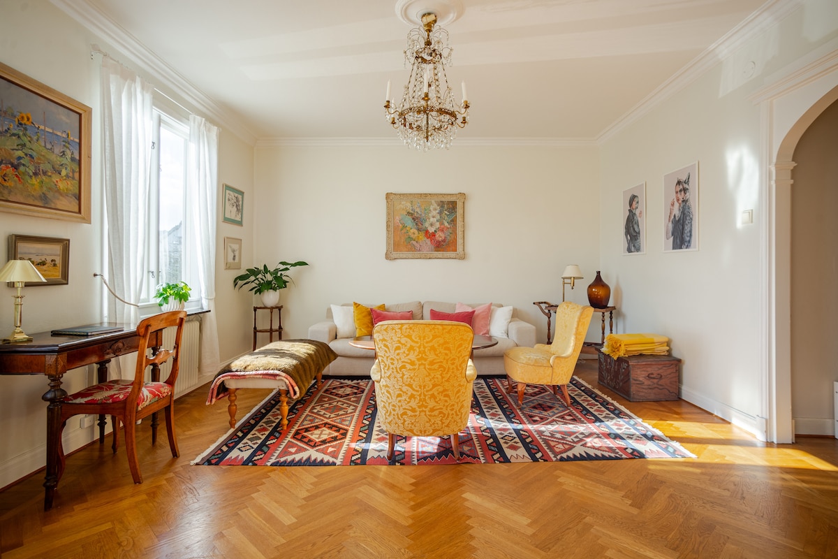 Enjoy a stay without comparison in an luxurious and spacious 110sq.m. topfloor appartment, in one of Gothenburgs most central private villas. Newly renovated and surrounded by greenery and a spaceous garden. 3 new king size beds, fully equipped kitchen, open fireplace, 65' tv and a homey atmosphere inside. Walking distance to shopping and sightseeing, Liseberg, Scandinavium, Avenyn, Universeum etc. Cafés and Restaurants all around.