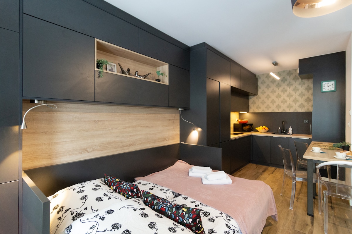 Welcome to Moonlight Shadow, a peaceful studio just steps from Kraków’s Old Town. Located on Krupnicza Street, this stylish retreat features a full kitchen, a comfy bed, and a dedicated workspace. With elegant black and grey decor and serene courtyard views, it's the perfect escape in the heart of the city. Only an 8-minute walk to Main Market Square, enjoy both tranquility and easy access to Kraków’s best spots.