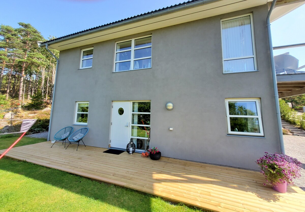 Huset ligger på Björktrastvägen 14 med ca 10 minuters gångavstånd till vackra Grönemad med bra badmöjligheter och strand. Här kan ni verkligen koppla av på en solig bergstomt som ansluter till naturen med lite insyn från grannar. Det är en perfekt plats för familjer och vänner att njuta av en avkopplande semester i en naturskön miljö.