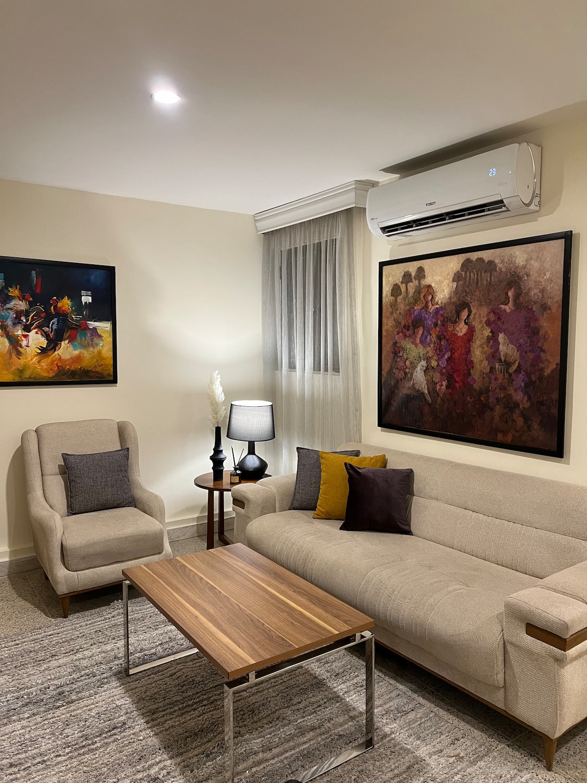 City center charm! Queen bed oasis w/ single option, heart of Mansour. Walk to shopping malls, cafes & more. AC chills, compact kitchen fuels. Modern nest near public transport. Unwind on comfy sofas, wash & stay. Your downtown Baghdad