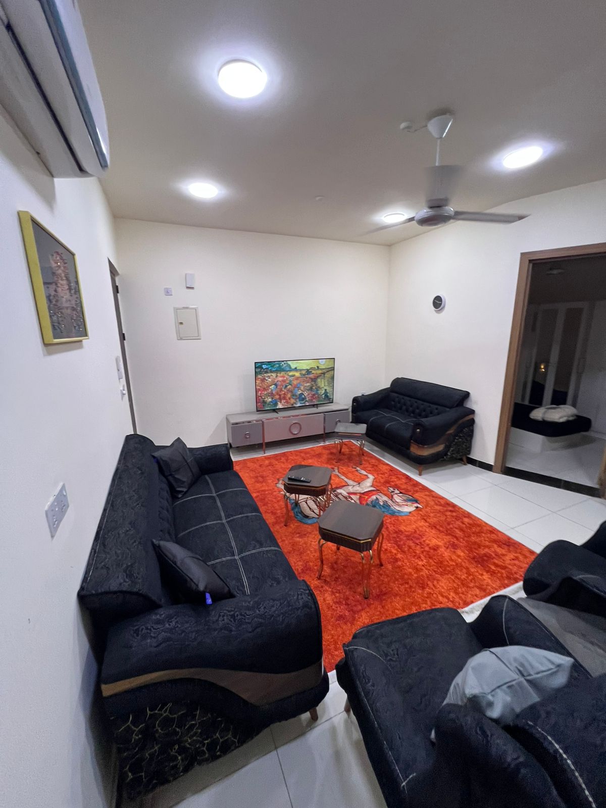 Forget your worries in this spacious and serene space consisting of 1 double bed and 2 single beds. inside the compound a super market ,laundry , bakery . Full air conditioning and 24/7 electricity