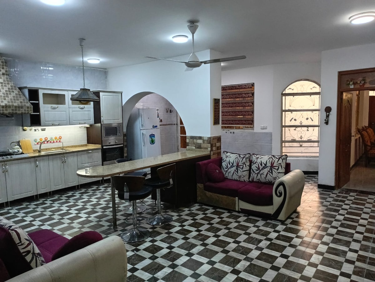 City center charm! Queen bed oasis w/ single option, heart of Mansour. Walk to shopping malls, cafes & more. AC chills, compact kitchen fuels. Modern nest near public transport. Unwind on comfy sofas, wash & stay. Your downtown Baghdad