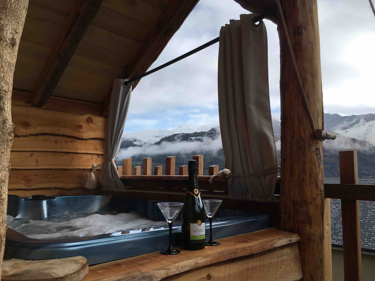 Chalet en bois, perché à 3,5 m en limite de la réserve naturelle du pibeste. Venez passer 2 nuits en amoureux ou une semaine en famille dans un cadre dépaysant et confortable. Equipé d'une petite cuisine, 2 chambres ouvertes, literie en 160, salle d'eau et toilette normale, une terrasse avec vue sur les sommets et d'un jacuzzi privatif, télévision. Le petit-déjeuner du1er et dernier jour est compris. Chalet pour 2 adultes et 1enfants, idéal en amoureux , randonneurs.