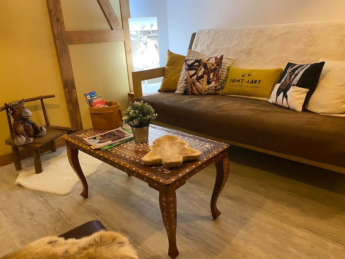 Welcome to Le Joli Terra'Cottage! Cozy studio in Saint-Lary, perfect for ski trips or hiking. South-facing terrace with Pyrenees views. Ideal for 2, can sleep up to 3 (inflatable mattress + baby cot). Residence with summer pool, sauna, gym, lounge with pool table, foosball & laundry—all free for guests. Ski lockers & bike room. Shops, restaurants & cable cars within walking distance. All comforts for a getaway as a couple, family or remote work.
