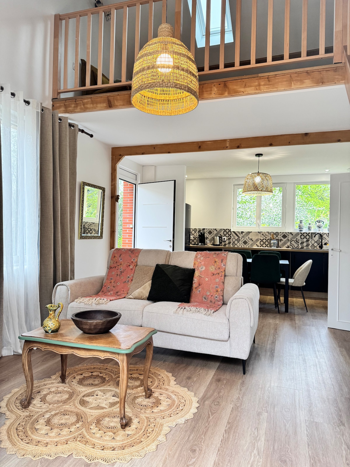 Insta : Normandy.guesthouse ⭐️ Meublé de tourisme classé 4* - Atout France 2025 🏡 Charmante maison en Normandie à 2h30 de Paris et 45 min des plages • Ancienne école en pierre rénovée • Logement ultra lumineux • Gand volume ouvert type loft • Hauteur sous plafond : 7,5 mètres • Rénové par une architecte