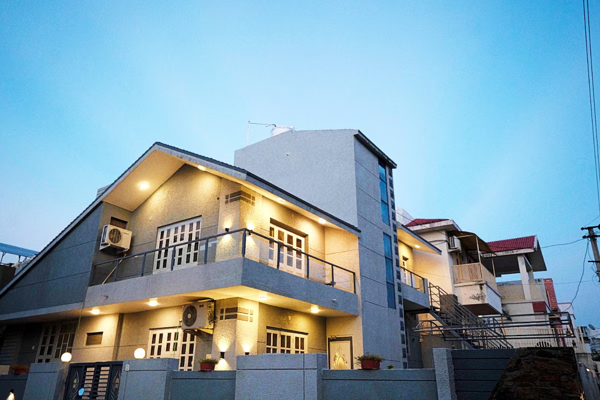 Bring the whole friends & family to this great place with lots of room for fun - All large rooms equipped with 55” inch TV. - Spacious, clean and beautifully furnished interiors - One Room with private Swimming Pool of 225 sqft - Fast Wi-Fi & Smart TV - Fully equipped kitchen-All essentials - 24/7 hot water & air conditioning - Private balcony - 2 car parking - Bathroom essentials- Biotique - EV charge ₹ 1200 Perfect for Couples & families looking for a stylish, peaceful, & well-connected stay