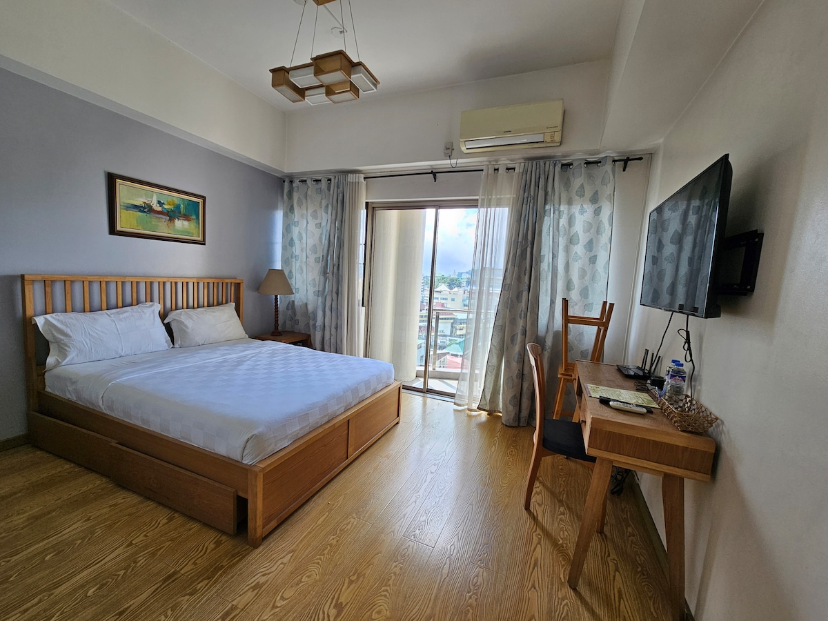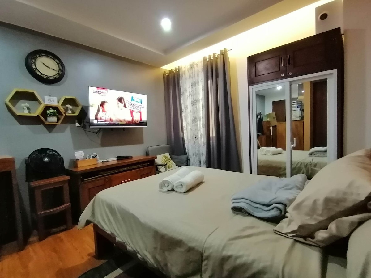 Styled & Managed by JQ PROPERTIES Cozy, private, and fully-furnished studio unit with fast wifi (10mbps). Comfy queen bed with Netflix on TV. Have extra guests stay with you with the comfy extra double mattress on the floor. This unit is located in a prime and vibrant area with lobby access to a mall with Savemore supermarket on lower ground. Across University of Baguio (UB), around the corner from restaurants and shops on session road, and walking distance from Burnham Park and SM.