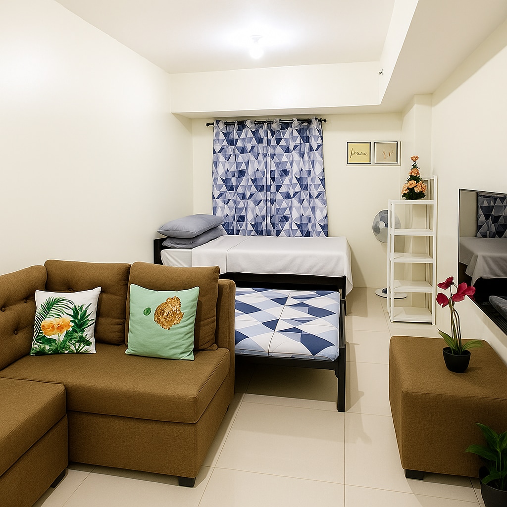 ✨ Baguio Vacation Rentals by Miss Len | Cozy Studio type family room. 🛏️ Spacious 27 sqm Studio Type Unit, just minutes away from SM Baguio, Session Road, Mines View, and other top tourist spots. 🌟 What You’ll Love: ✔️ Double Bed + Pull-out Bed + Sofa ✔️ Fully Equipped Kitchen ✔️ 50" Smart TV with Netflix ✔️ Fast Wi-Fi ✔️ Hot & Cold Shower ✔️ Secure Parking Available ✔️ Good for up to 6 pax Budget friendly private Condo Unit, with 24/7 security.