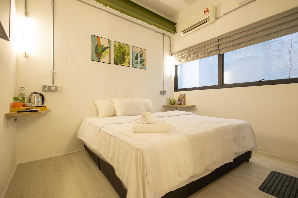 A cozy Japanese-style tatami room designed for simplicity and comfort. Ideal for solo travellers or couples looking for a clean, efficient space. Features warm lighting, minimalist décor, and a comfortable Queen Tatami bed.Amenities:Air-conditioning, WiFi, private bathroom, rainfall shower, smart storage, 32” TV.