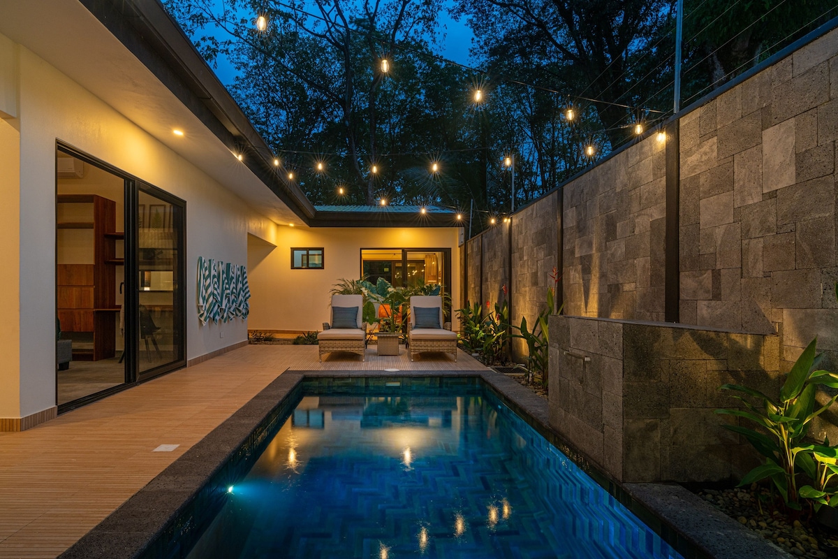 Open-concept villa equipped with all the comforts of home; fully stocked kitchen, smart TV, BBQ, plunge pool, wifi, and a private terrace/backyard. End a perfect day by sinking into the luxurious King bed, raved by guests as the comfiest bed in town. NO visitor policy and PLEASE no children/babies permitted. No 4X4 needed. Walking distance to shops, restaurants, banks, grocery stores, a short drive to Marino Ballena National Park and the most beautiful beaches!