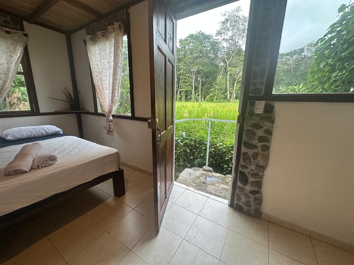 Conecta con la naturaleza de Uvita de Osa en este acogedor studio privado junto al bosque con vista al mar donde los amaneceres y atardeceres abrazan este tranquilo lugar. Localizado muy cerca de las playas, ríos, cascadas, restaurantes y todos los servicios. Disponible para dos personas, cama Queen, cuarto de baño privado, ducha con agua caliente, A/C, una pequeña refrigeradora, coffee maker, TV y WIFI. El parqueo es amplio, seguro y acceso privado con portón accionado a control remoto.