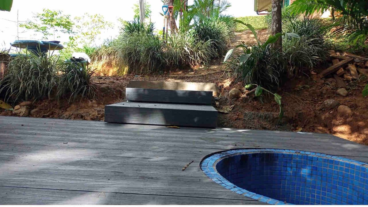 New modern jungle Cabina. Two small but comfortable bedrooms. A queen bed in each. The Cabina has it's own beautiful covered porch, BBQ area, dining area and chair swings as well as lounge chairs. Enjoy the day by the shared pool and covered deck area. Visit our horses, and chickens. Walk our trails, pick fruit, enjoy the Tucans flying by and the Howler monkeys swinging in the trees. Uvita town is only 10 minute walk or 20 minute walk to the famous Whales tail.