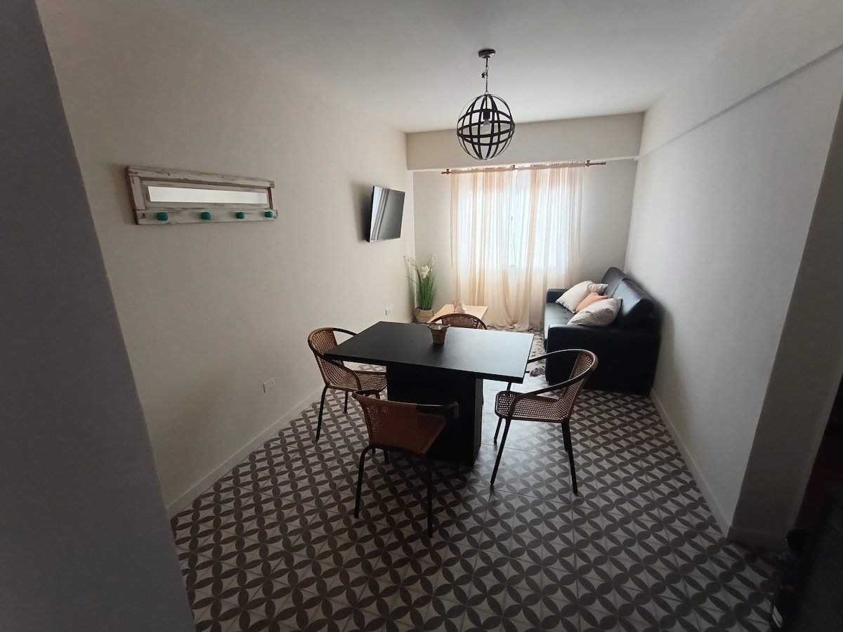 El dpto se encuentra en excelente ubicación, a solo 3 cuadras de Plaza principal y centro comercial. Está muy bien equipado y es confortable. Posee 2 camas, 1 cama de 2 plazas y 1 camas de 1 plaza. Cuenta con ropa de blanco sábanas, frazadas,b almohadas y toallas. Con AA frío calor y ventilador de piso( turbo) Es muy luminoso y con buena ventilación cruzada. Posee un pequeño balcón. El dpto esta en el 1er piso y el edificio tiene ascensor. y con cochera en el edificio.
