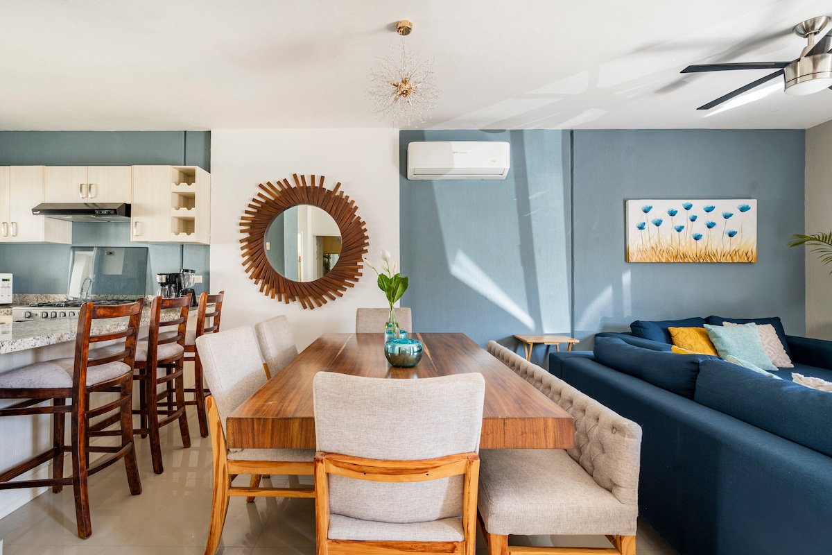 Make unforgettable memories at this unique and family friendly place. This home away from home, has an fully equipped kitchen, 3 bedrooms, 3 bathrooms, with modern air conditioning, 12 ft ceiling with modern fans in each room, a small (cool)dipping pool, rooftop terrace, and a patio with palapas. It's located right on the main street near convenience stores, restaurants, shops, and pharmacies. 10 mins stroll to the beach for breathtaking sunsets and sunrises. Or hit the waves for surfing ride.